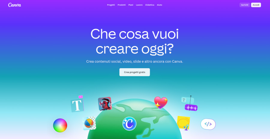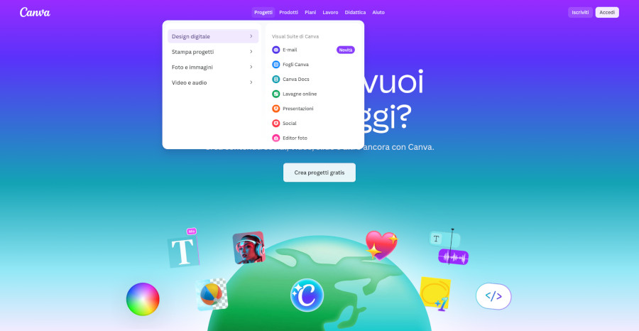 La seguente è la pagina iniziale di Canva nella quale è visibile una panoramica delle tipologie di prodotti grafici che l'applicazione permette di creare.