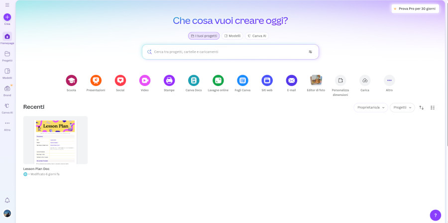 La seguente è la dashboard, accessibile dopo l'autenticazione. La sezione “homepage” permette di accedere ai propri progetti recenti e ricevere suggerimenti sulle diverse tipologie di contenuto da creare.