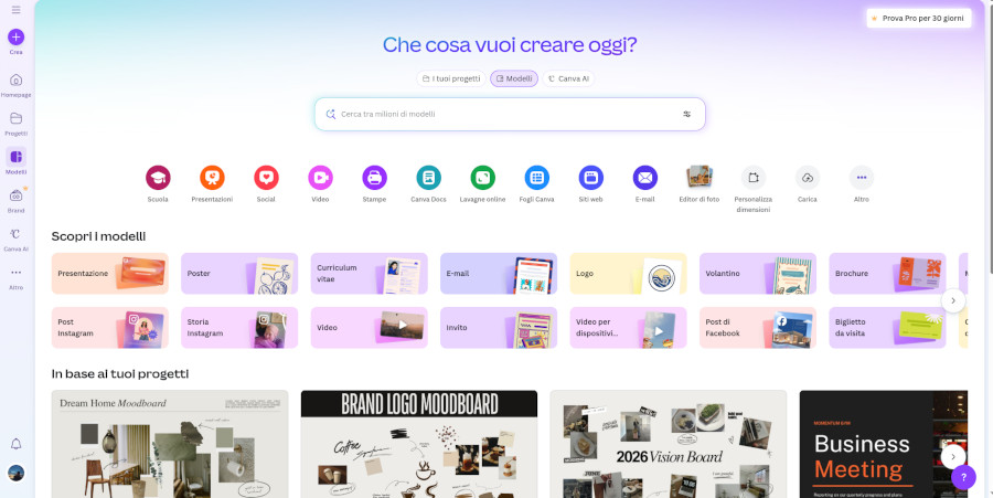 Nella sezione “modelli” Canva presenta dei progetti preimpostati da utilizzare come base di partenza per il prodotto da creare. La suddivisione in categorie e sottocategorie facilita il reperimento del modello adatto alle proprie esigenze sia per tipologia che per dimensione.