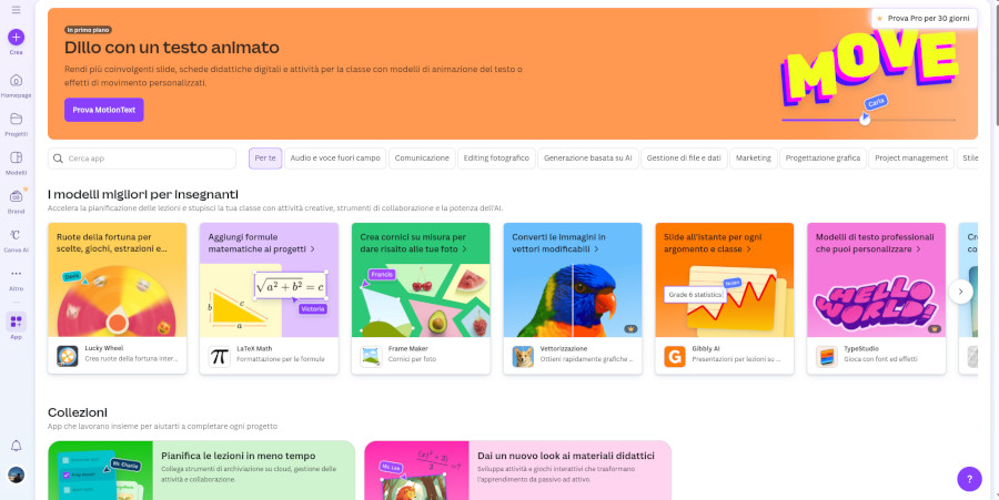 Nella sezione “app” si possono cercare diverse app di Canva utili per svolgere moltissime operazioni, come per esempio aggiungere ombre a un’immagine, aggiungere animazioni, cornici alle immagini, ecc.