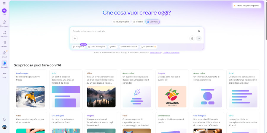 Nella sezione “Canva AI” si possono creare contenuti attraverso l'utilizzo dell'intelligenza artificiale, in numero limitato in caso di profilo "free". Attraverso semplici prompt, Canva AI permette di generare automaticamente design come presentazioni, post social, flyer e loghi, affiancando la scrittura assistita per testi e copy. Supporta inoltre la creazione di immagini da testo, la modifica intelligente dei contenuti (ridimensionamento, rimozione sfondi, ottimizzazione di layout e colori) e la realizzazione di brevi video e animazioni per i social. Un’ulteriore funzione rilevante è la generazione di codice. Canva AI può produrre semplici porzioni di codice utili a creare contenuti interattivi, come mini-app, giochi educativi e quiz digitali.