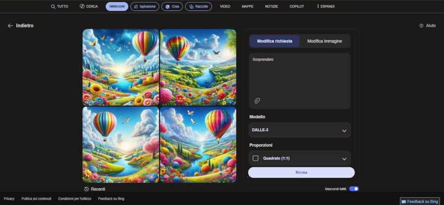 La seguente schermata mostra la home di Bing Image Creator, dalla quale è possibile inserire immediatamente il testo che si desidera trasformare in un’immagine. La pagina è integrata all’interno delle funzionalità offerte da Microsoft Bing.