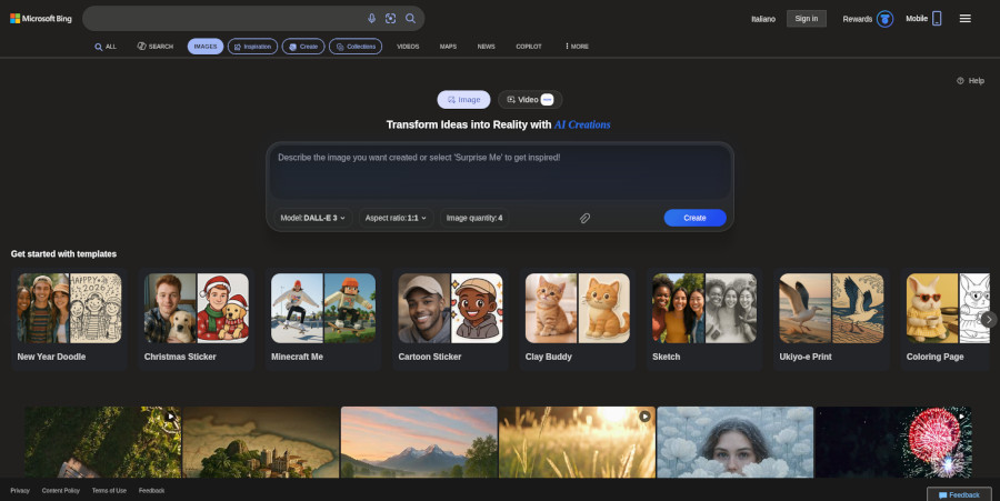 The following screen shows the Bing Image Creator home page, from which users can immediately enter the text they want to transform into an image. The page is integrated within the features offered by Microsoft Bing.
