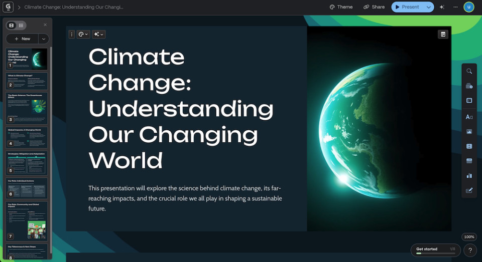 Below is an example of a presentation generated with Gamma. The presentation, initially created by artificial intelligence, can subsequently be modified and customized by the user. It is possible to add new slides, change the existing layout, or modify the text to adapt it to one's needs. All projects are automatically saved to ensure continuity of work. It is also possible to share projects with others via their email address, thus facilitating simultaneous collaboration. The project can also be shared via a dedicated link, exported in various formats including PDF or PPT, or even published as a standalone website.