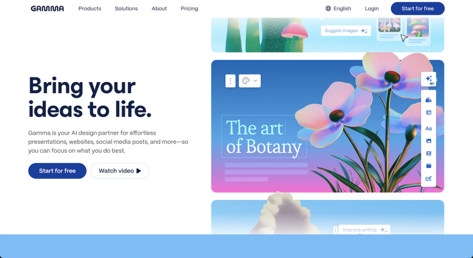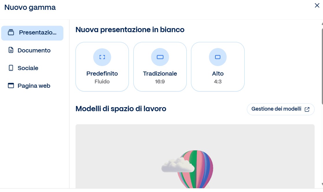 The following is the home screen of Gamma. Here, it is possible to access one's account or start for free. The home page provides an overview of the main functionalities offered by the platform, such as AI-assisted creation of presentations, websites, or social media content. In the upper part, there are links to consult the available plans (free or paid) and collaboration opportunities. After registration, it is possible to explore predefined templates to start from or create documents and presentations with the support of artificial intelligence.