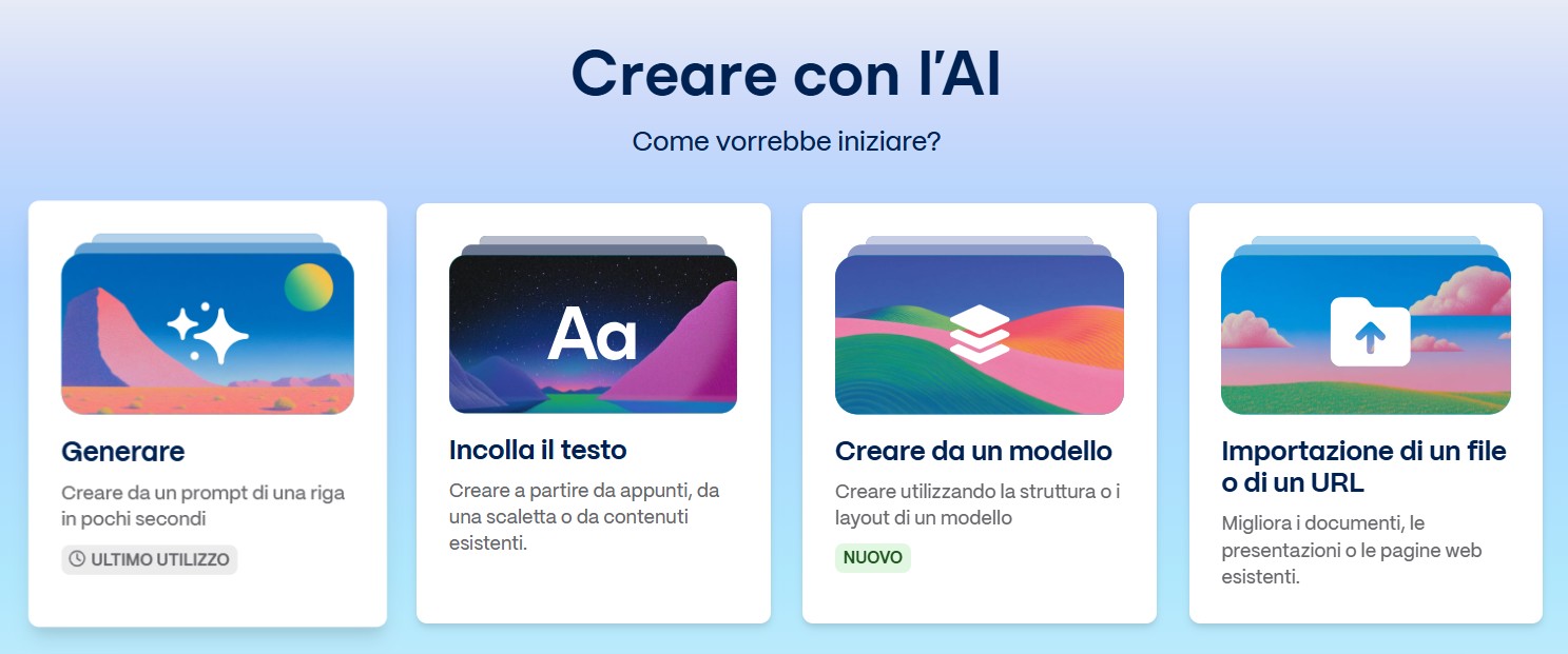 The following is the screen that appears once logged into the app. The user can choose how to start creating content with the support of artificial intelligence, by selecting one of the three available options: paste text (e.g., notes, outlines, or existing content), generate from scratch starting from a text prompt, or import a file or a link. Based on the choice, the application will start the guided process for creating presentations, documents, or other visual formats.