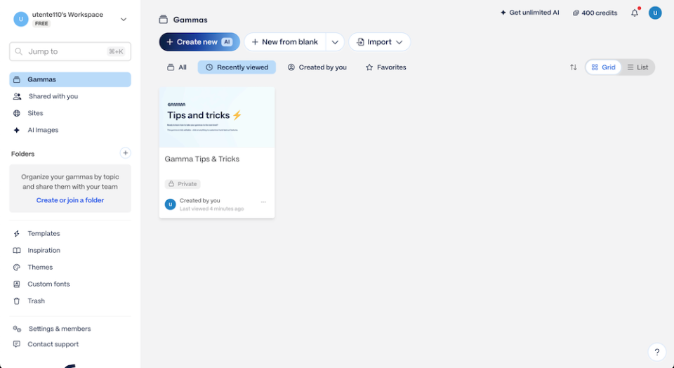 The following is the dashboard of one's account, where it is possible to view all content created by or shared with the user, as well as access predefined templates divided by category. The interface allows for starting the creation of new projects via artificial intelligence by selecting "Create new AI" or creating content from scratch by clicking on "New from blank." Through the "Import" menu, it is also possible to upload files or projects from external sources. In the left sidebar, there are entries to access sites, AI images, personal or shared folders, and additional resources such as themes, custom fonts, and inspirational templates.